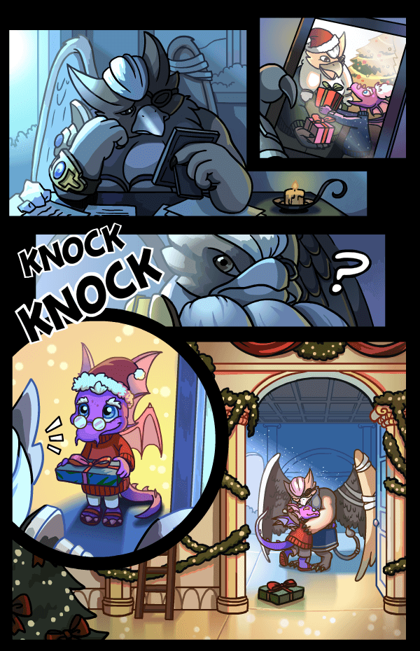 ¡Ey, ya te vi! Este año no buscaremos un elemento oculto entre las animaciones, ya que que vienen en formato de historieta. Pero a nuestros laterales de la página estará apareciendo Reina para que al hacerle clic podamos recibir un premio extra de temática invernal y navideña.
